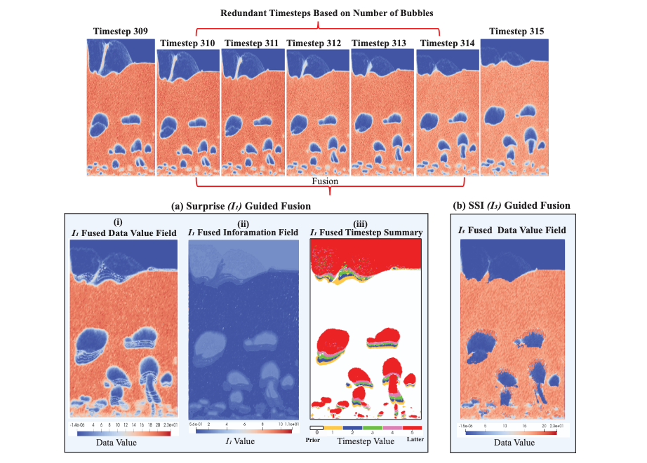 ![]() | [C17] Humayra Tasnim, Soumya Dutta, and Melanie Moses, Dynamic Spatio-Temporal Summarization using Information Based Fusion, International Conference on Computational Science and Computational Intelligence (CSCI 2025). [Link] [Pdf] [BibTex] [Accepted] AbstractIn the era of burgeoning data generation, managing and storing large-scale time-varying datasets poses significant challenges. With the rise of supercomputing capabilities, the volume of data produced has soared, intensifying storage and I/O overheads. To address this issue, we propose a dynamic spatio-temporal data summarization technique that identifies informative features in key timesteps and fuses less informative ones. This approach minimizes storage requirements while preserving data dynamics. Unlike existing methods, our method retains both raw and summarized timesteps, ensuring a comprehensive view of information changes over time. We utilize information-theoretic measures to guide the fusion process, resulting in a visual representation that captures essential data patterns. We demonstrate the versatility of our technique across diverse datasets, encompassing particle-based flow simulations, security and surveillance applications, and biological cell interactions within the immune system. Our research significantly contributes to the realm of data management, introducing enhanced efficiency and deeper insights across diverse multidisciplinary domains. We provide a streamlined approach for handling massive datasets that can be applied to in situ analysis as well as post hoc analysis. This not only addresses the escalating challenges of data storage and I/O overheads but also unlocks the potential for informed decision-making. Our method empowers researchers and experts to explore essential temporal dynamics while minimizing storage requirements, thereby fostering a more effective and intuitive understanding of complex data behaviors. |